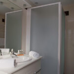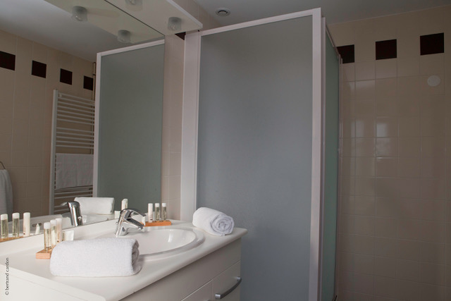 Parquet, poutres, lit double, salle de douche spacieuse et WC séparés.